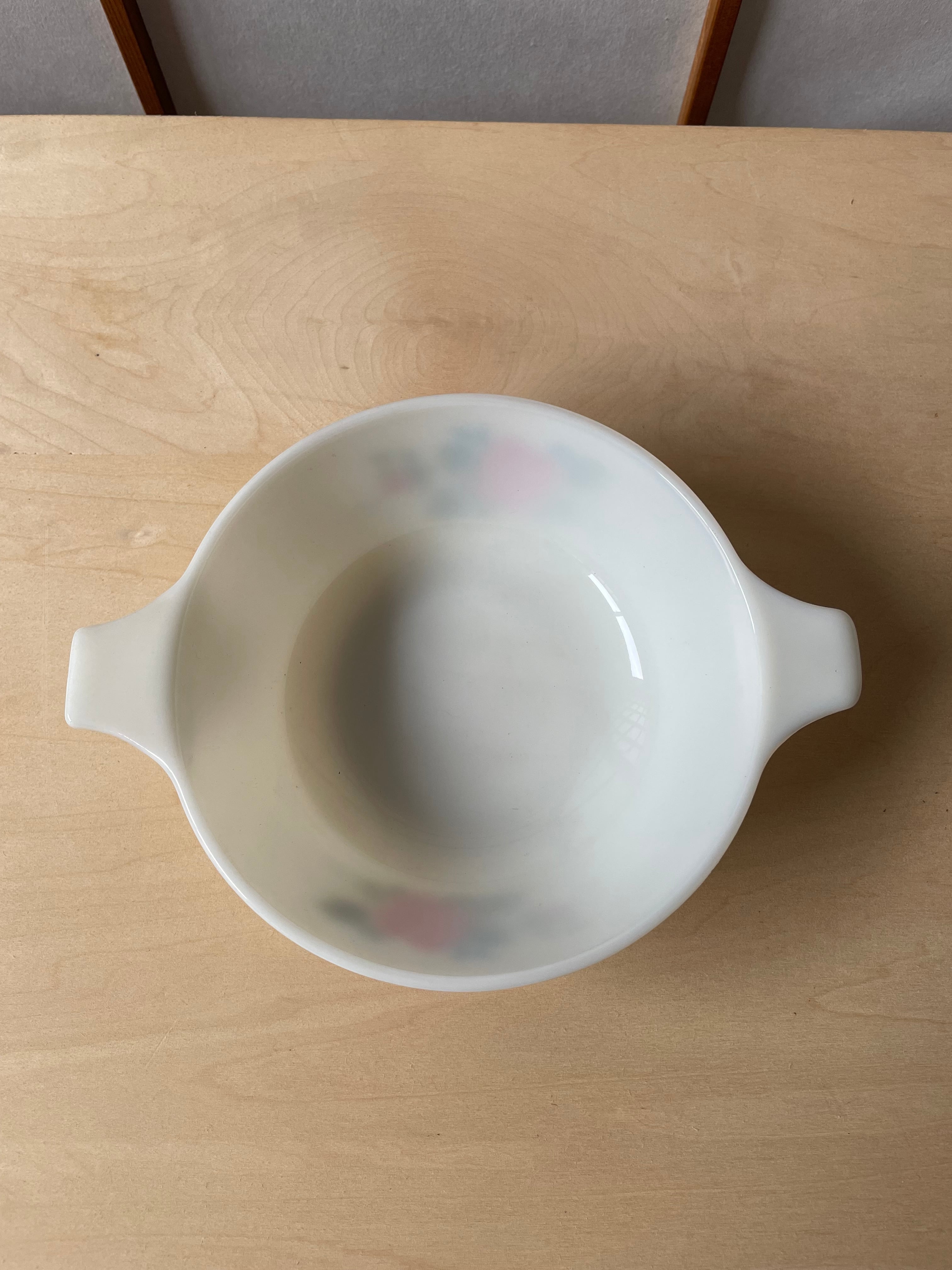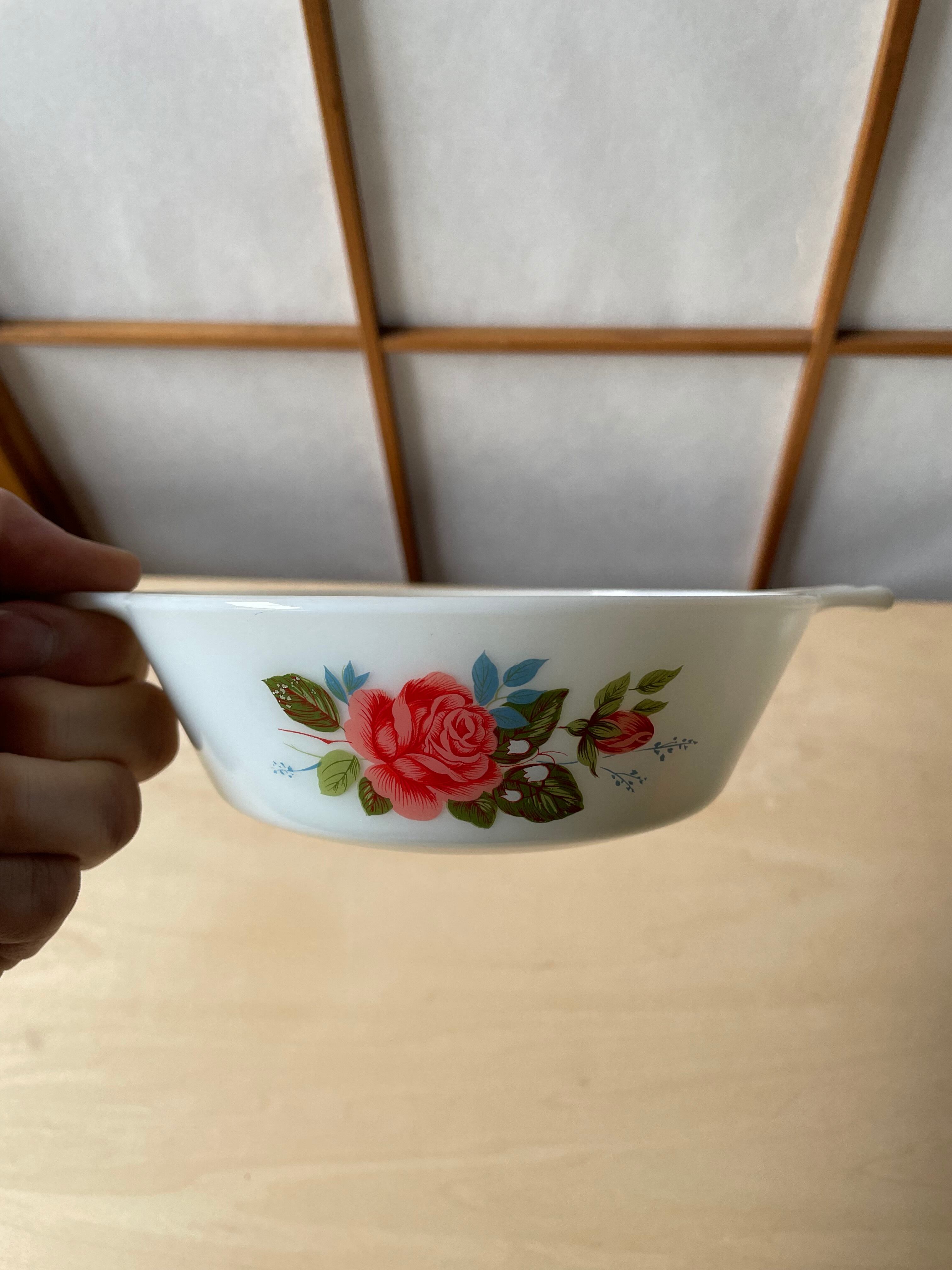 MADE IN ENGLAND、JAJオールド パイレックス、コテージローズシリーズのミルクガラスキャセロールです。