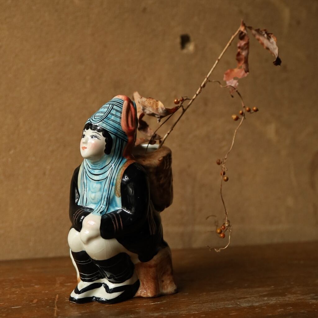 ヴィンテージ土産/古道具/置物/陶器/磁器/花籠を背負った少女の花瓶