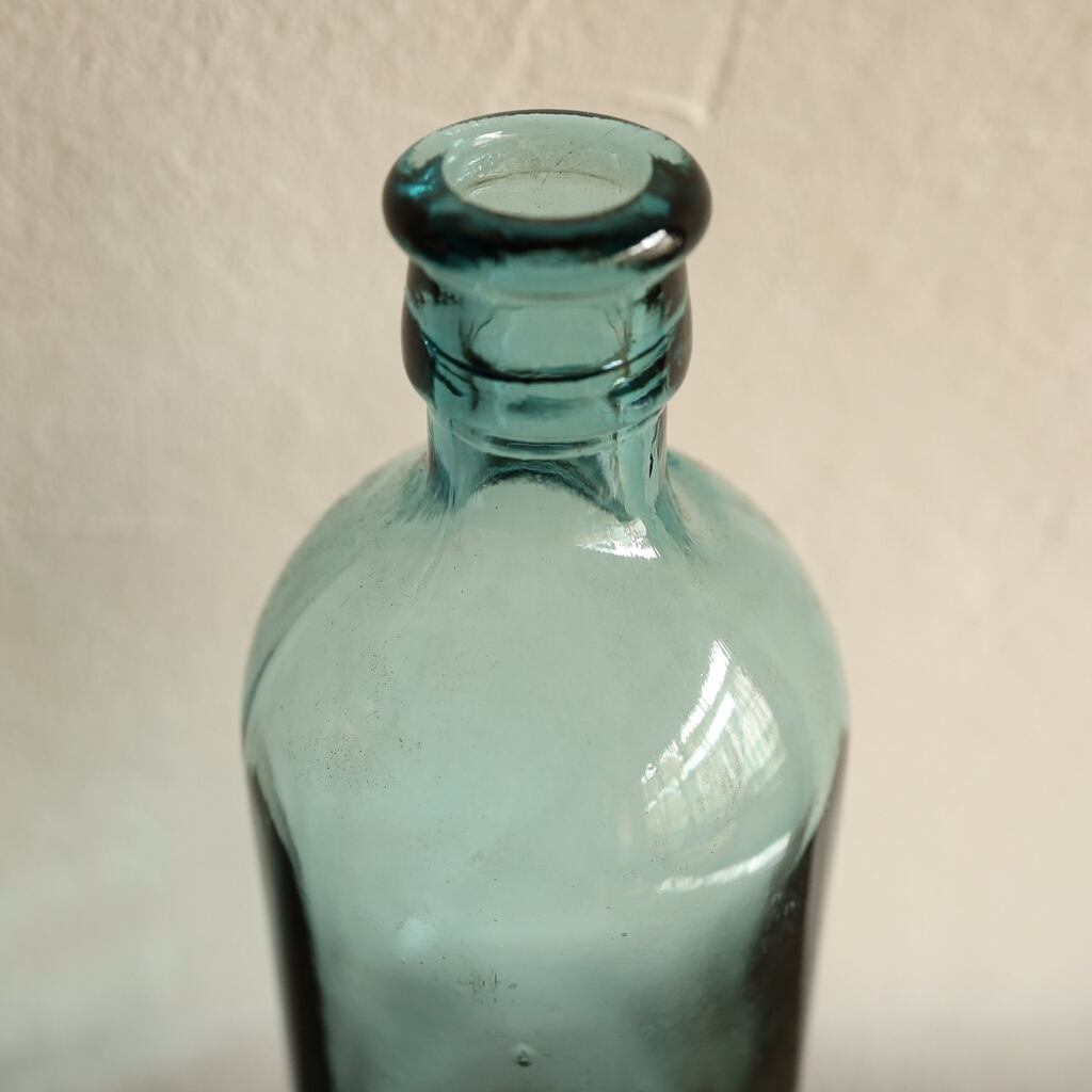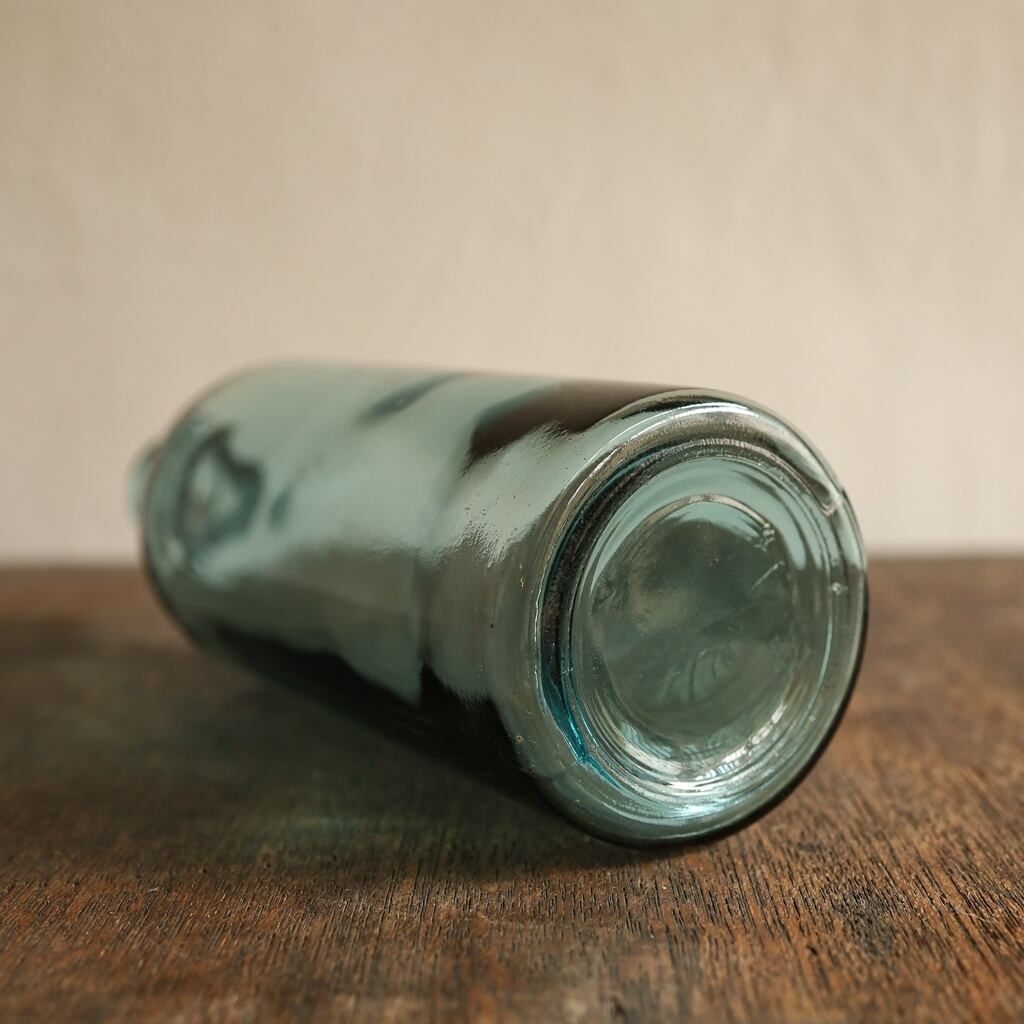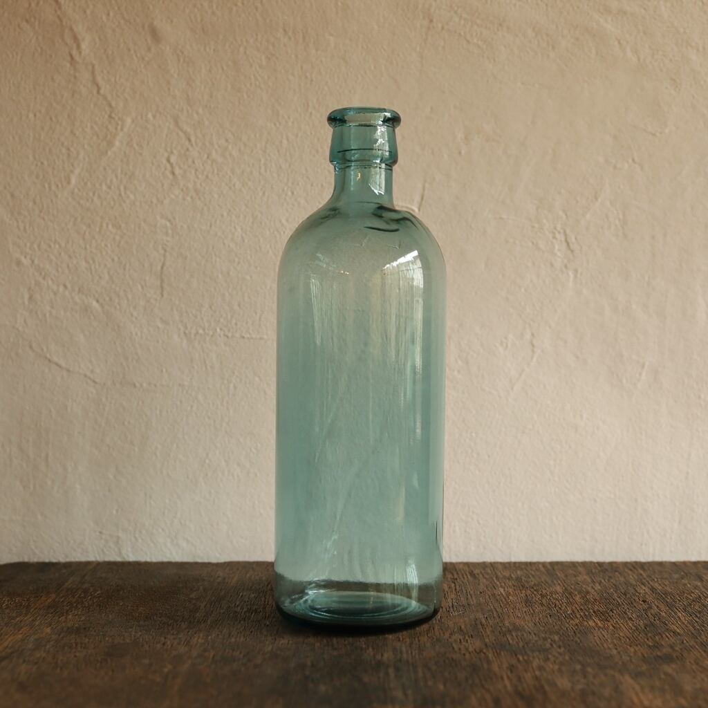 薄っすらと青みがかった硝子がソーダのように綺麗な色が特徴で、ところどころに小さな気泡があり、曲線の感じやガラスのユラユラ感が素敵な瓶。