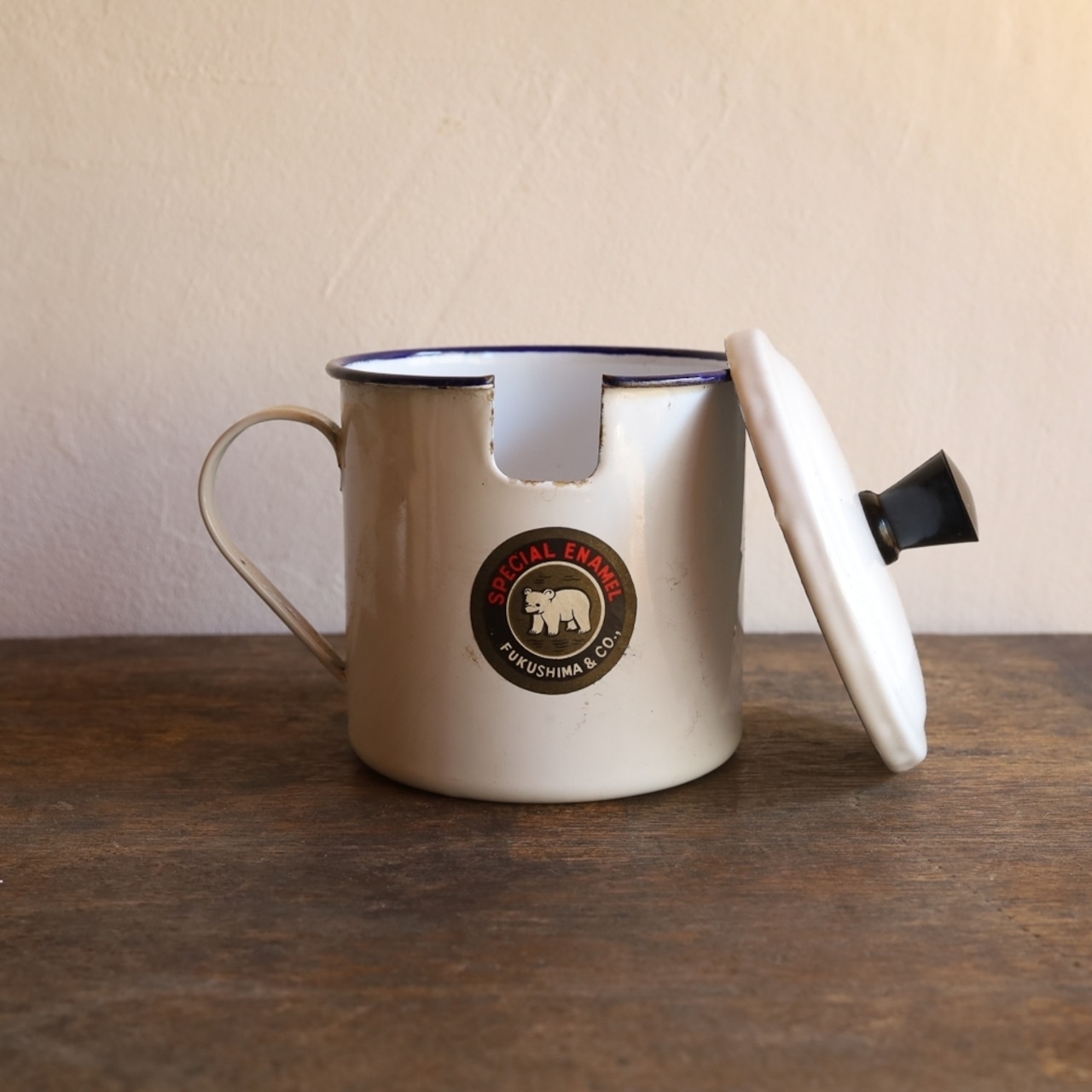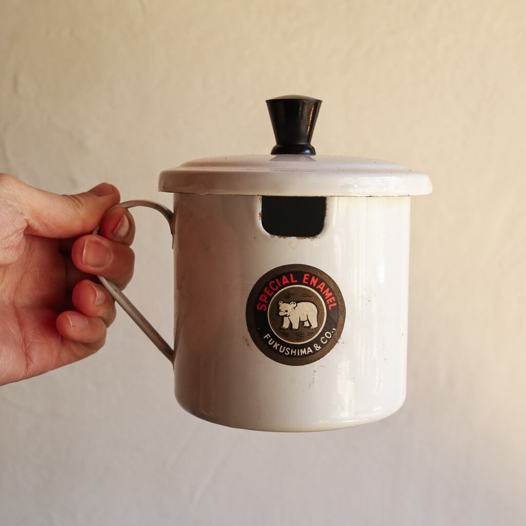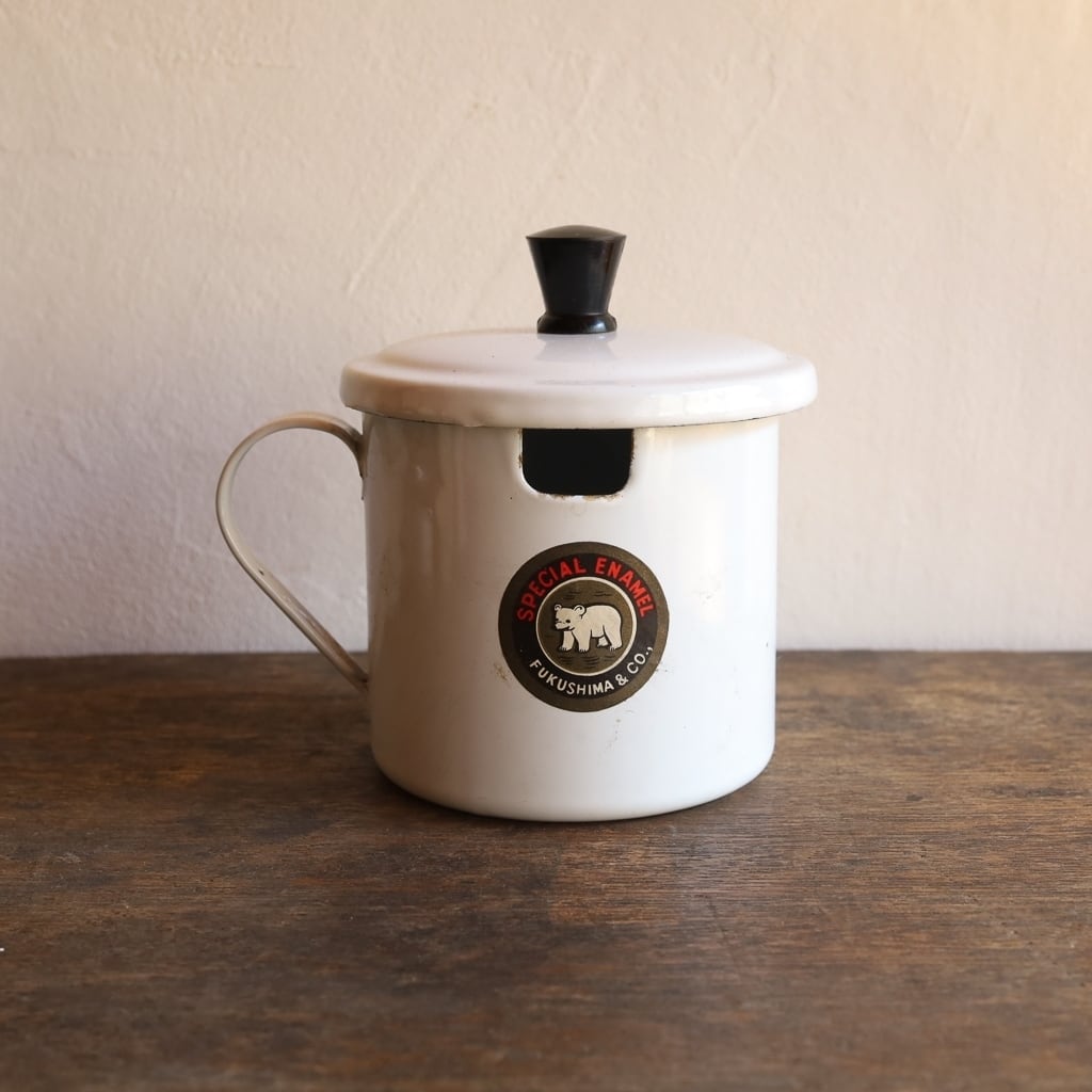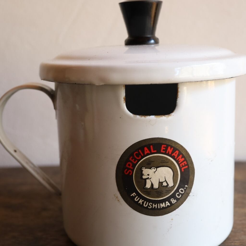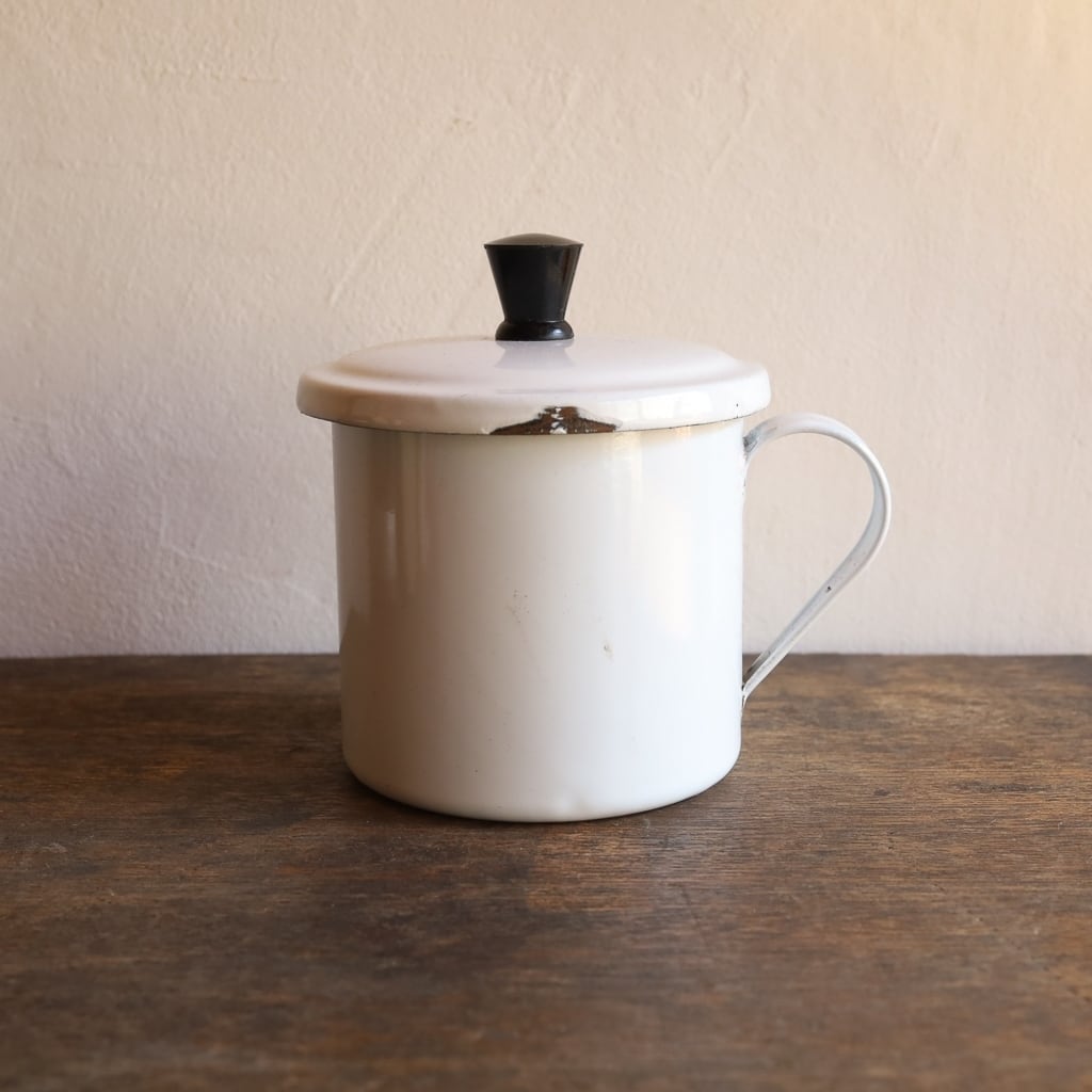 1970年代、福島琺瑯のオイルポット・調味料ポット。便利な蓋付きです。